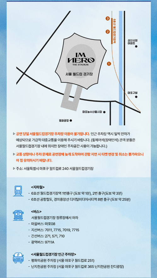 ■ 본 공연은 그라운드를 포함한 동/서/남/북 다방면을 무대로 활용하는 공연 형태로, 연출 콘셉트, 아티스트 위치 등에 따라 일부 좌석은 후면석의 컨디션 및 시야 제한이 발생할 수 있으며, 곡 별 연출 상황에 따라 라인/구조물/장치/카메라 등으로 인해 일부 시야 방해가 발생될 수 있는 점 양해 부탁드립니다. 공연 당일 시야 방해로 인한 티켓 환불 및 변경은 불가능하오니 양해 부탁드립니다.