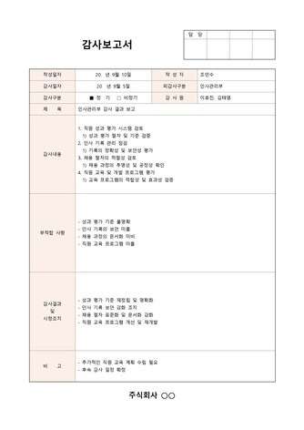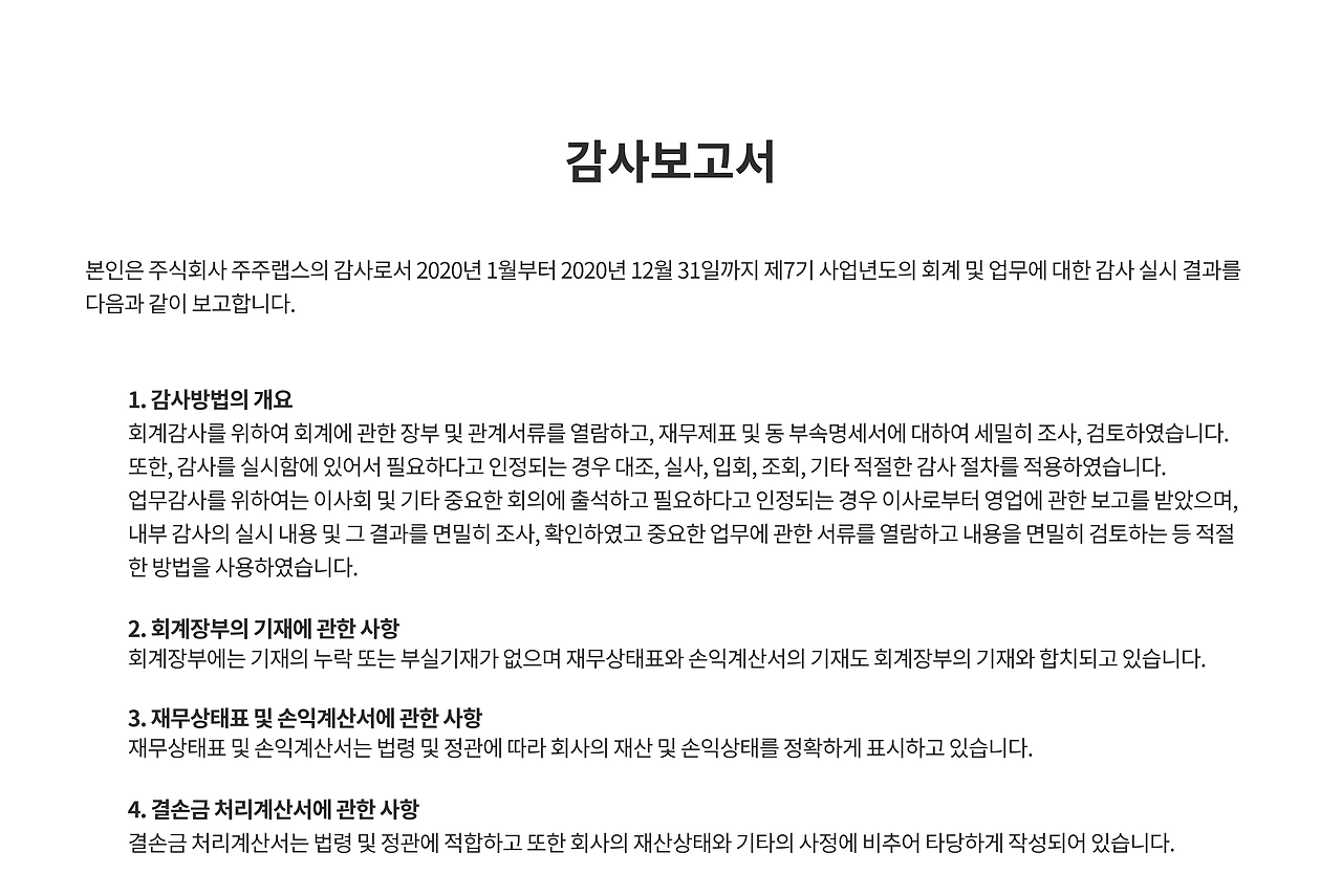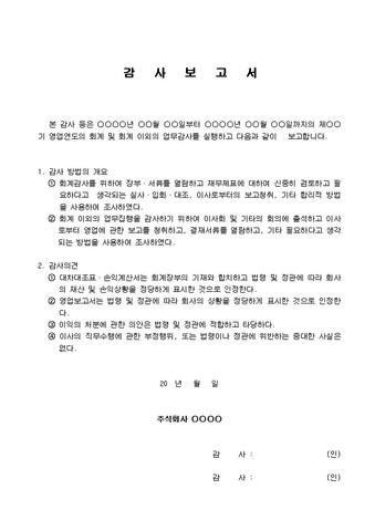 • 감사 결과 : 재무제표의 적정성 여부 및 발견된 문제점을 나열합니다.